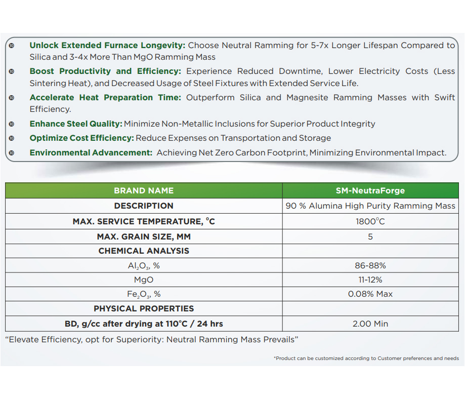 Neutral ramming mass is a refractory lining material used in induction furnaces and other smelting vessels. It is a mixture of refractory aggregates, binders, and additives. This mass is characterized by its neutral chemical composition, making it suitable for use with acidic, basic, and neutral slags. Its high refractoriness and thermal stability enable it to withstand high temperatures and thermal shocks, ensuring optimal furnace performance and longer service life.